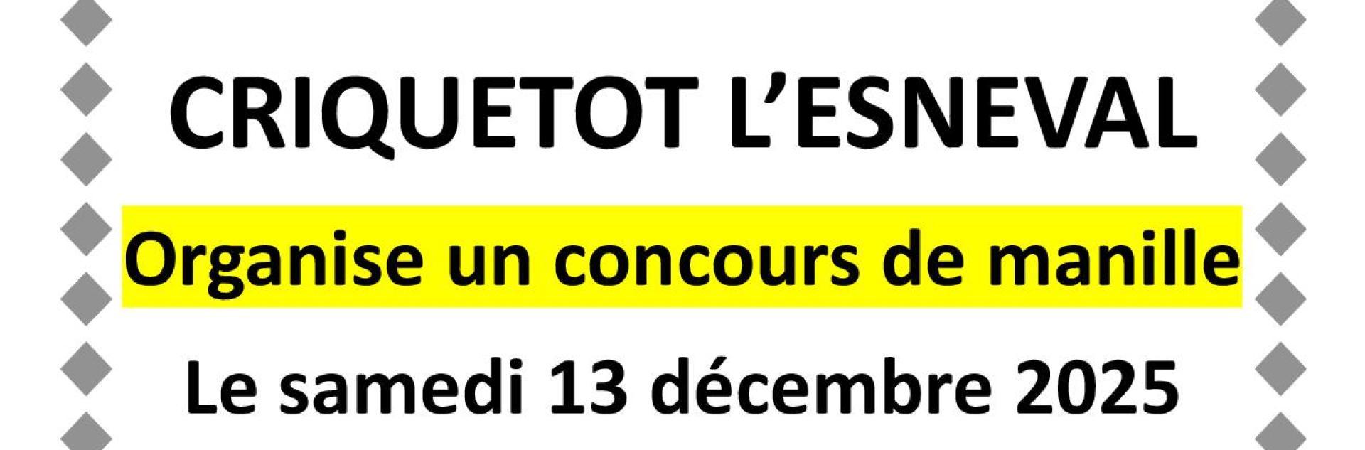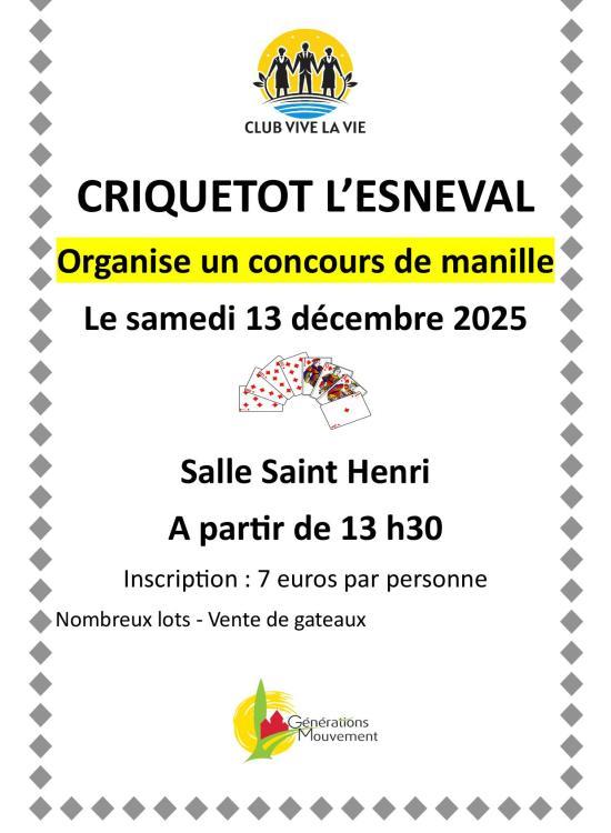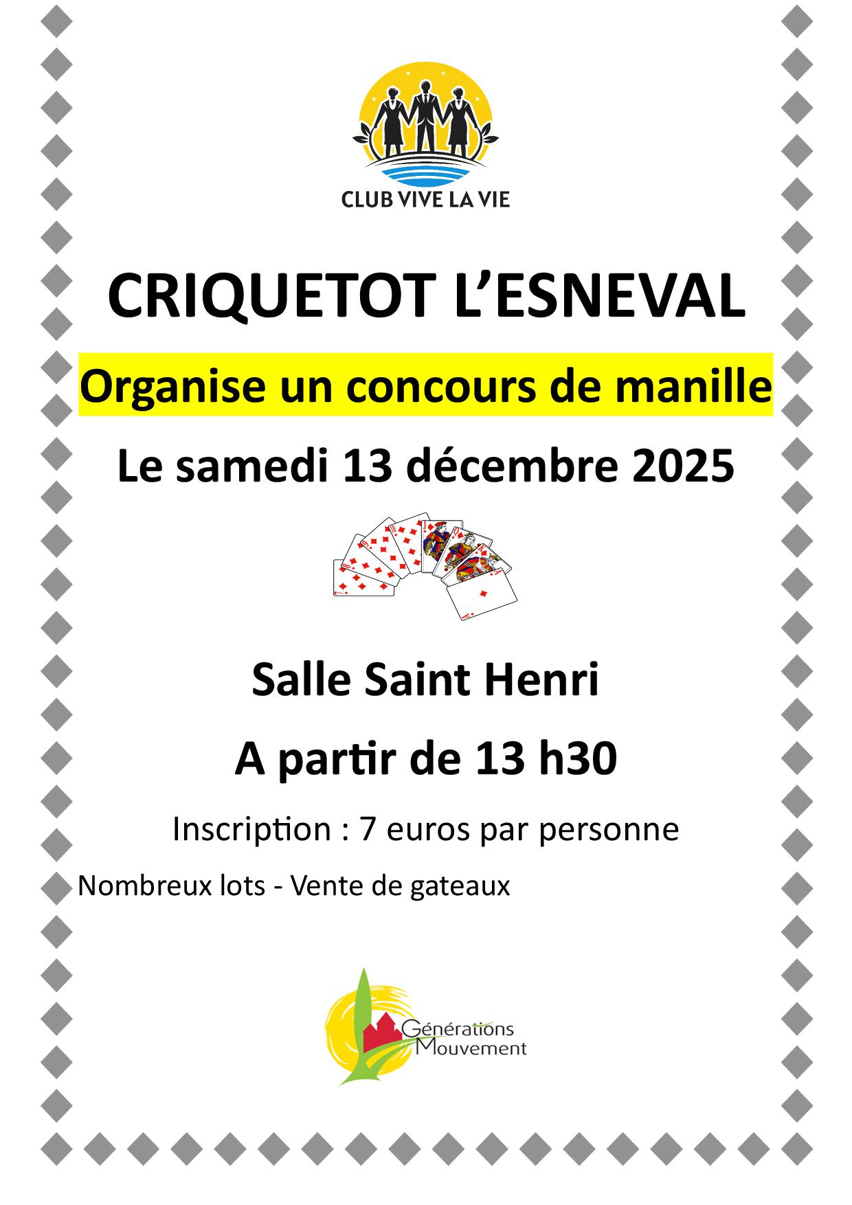 Du 13 Déc Concours de manille Timetable : 13h30 Adresse : Salle Saint Henri Ajouter au calendrier Sur la carto Salle Saint Henri Fermer Precedent Retour à la liste Suivant