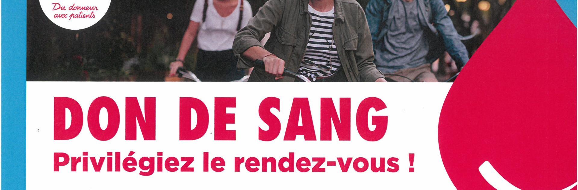 Du 12 Avr Don du sang Timetable : 15h00 - 19h00 Adresse : Salle des Fêtes Ajouter au calendrier Sur la carto Salle des Fêtes Fermer Precedent Retour à la liste Suivant