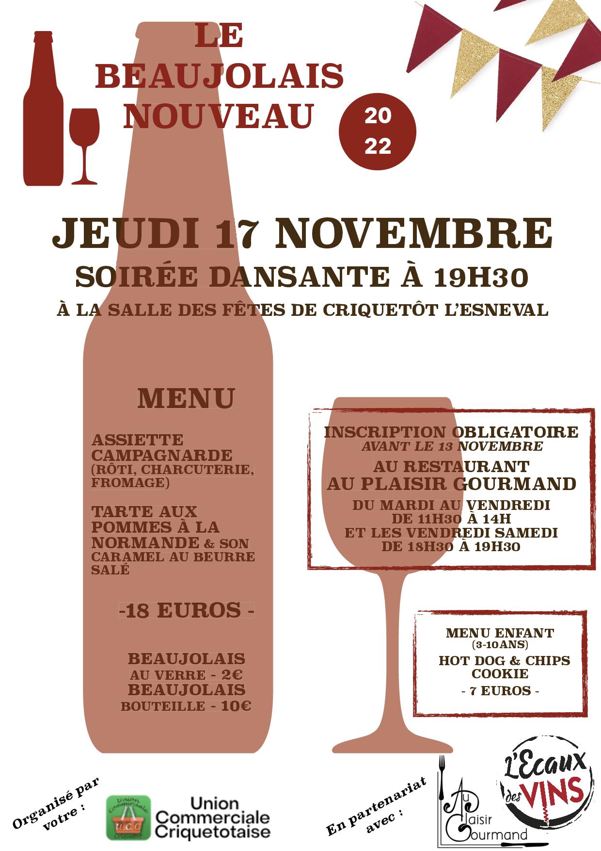 Du 17 Nov Soirée Beaujolais Timetable : 19h30 Adresse : Salle des Fêtes Ajouter au calendrier Sur la carto Salle des Fêtes Fermer Precedent Retour à la liste Suivant